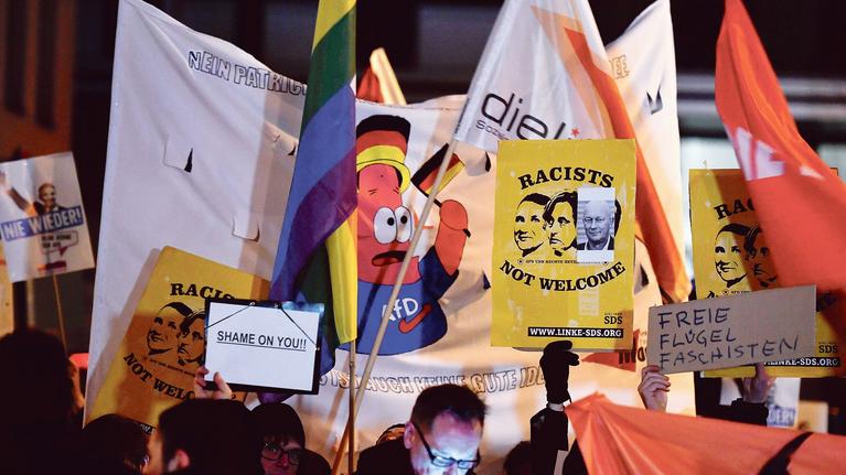 „Ein Liberaler ist mit den Stimmen der AfD an die Spitze des Landes Thüringen gewählt worden. Diese Durchtrennung des ‚Seuchenschutz-Sperrgürtels‘ um die extreme Rechte herum ist nach dem Ende des Zweiten Weltkrieges eine Premiere,“ untertitelt das Blatt den Artikel seines Berlin-Korrepondenten Pierre Avril. Er ist meinen Lesern schon bekannt als Feind Rußlands und neuerdings auch als Feind der AfD. Die Informationen wie auch das Foto der antifaschistischen Demonstranten, in Berlin, „Freie Flügel Faschisten“, „Rassisten nicht willkommen“, liefert wie gewöhnlich die AFP.